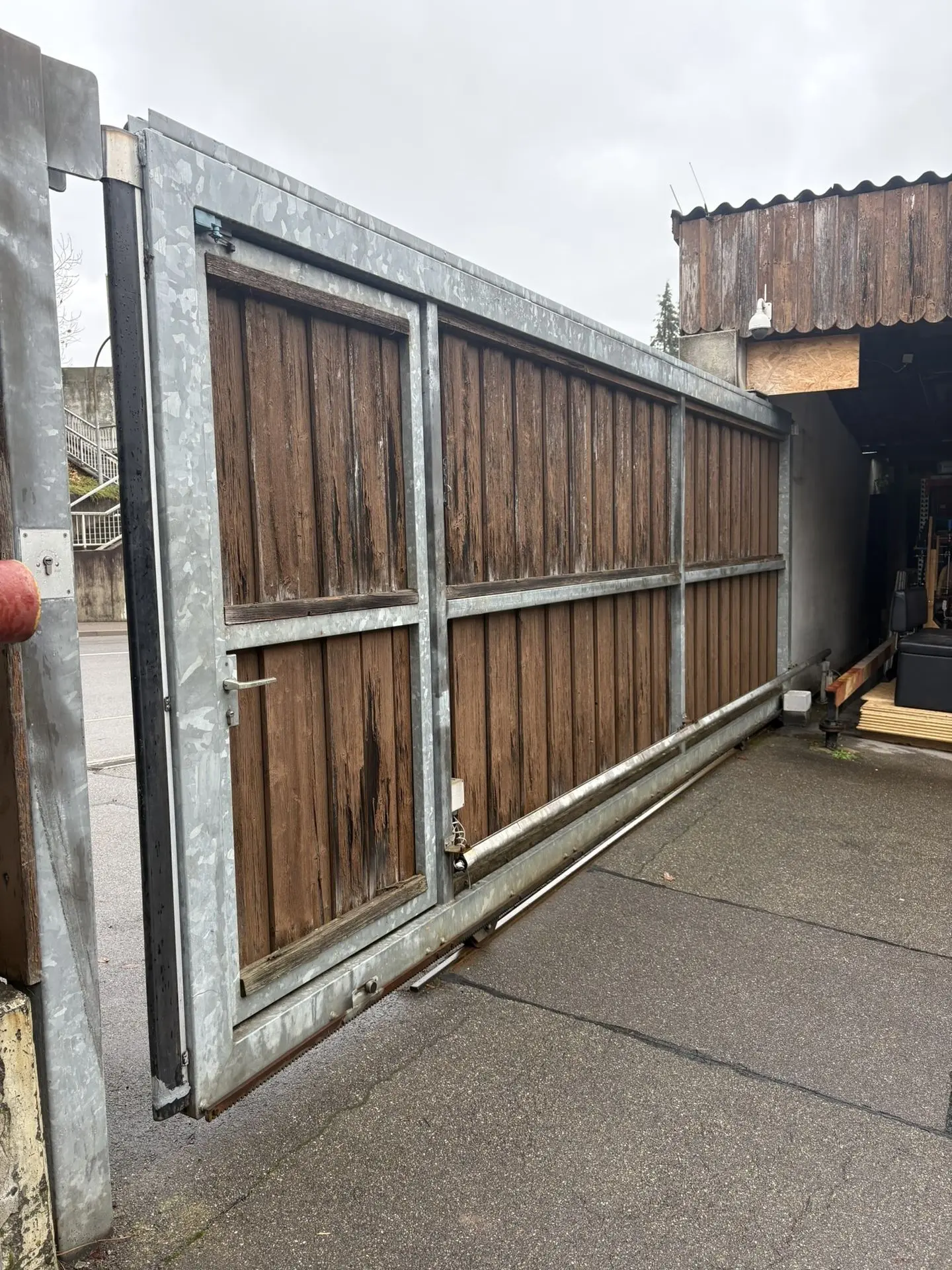 Bei dieser schweren Stahl-Holz-Konstruktion war ein leistungsfähiger und präzise abgestimmter Antrieb gefragt. Das Tor befindet sich direkt an einer Hauptstraße und muss schnell, zuverlässig und vor allem sicher öffnen und schließen. Durch den fachgerechten Austausch des Antriebssystems inklusive Berücksichtigung der integrierten Schlupftür wurde die Anlage technisch optimiert und auf den neuesten Stand gebracht.